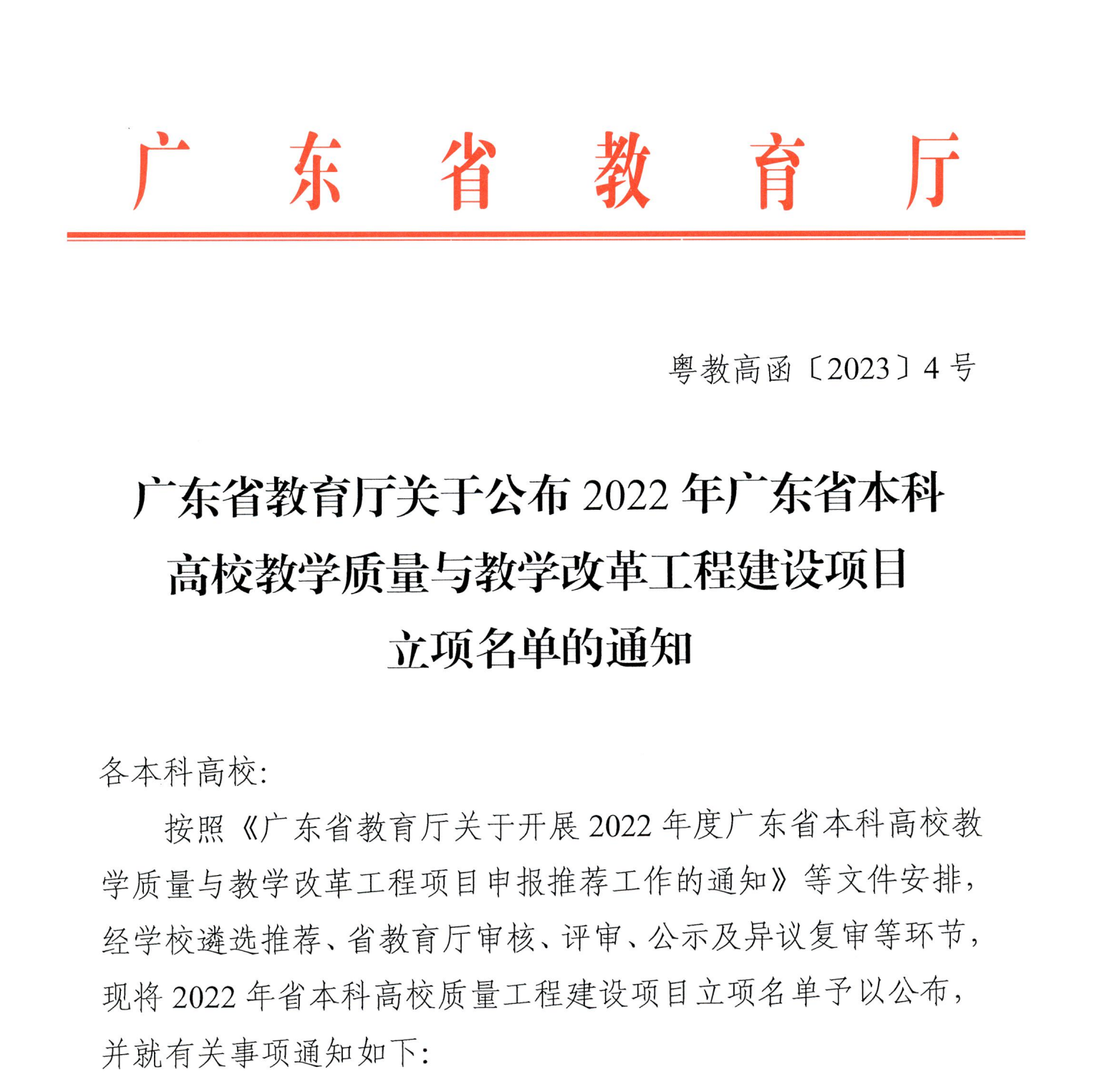 近日,广东省教育厅公布了2022年广东省本科高校教学质量与教学改革工程建设项目立项名单(粤教高函〔2023〕4号),太阳成tyc7111cc申报的2个项目均获立项,成绩喜人。
