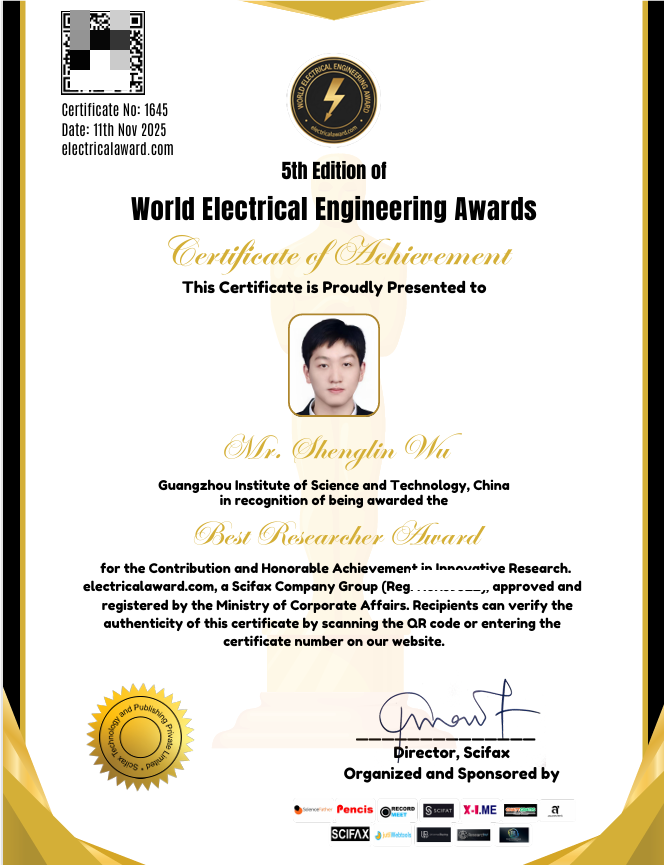 近日,太阳成tyc7111cc吴晟霖老师在外骨骼机器人人因功效测试研究取得了重要进展,研究经多轮次遴选和评审委员会评审,获国际知名学术组织“科学之父”(Scifax)颁发的2025年“第5届世界电气工程奖-最佳研究者奖(Best Researcher Award, 5th Edition of World Electrical Engineering Awards)”。该奖项旨在表彰在创新研究方面有着重要贡献和杰出成就的学者。