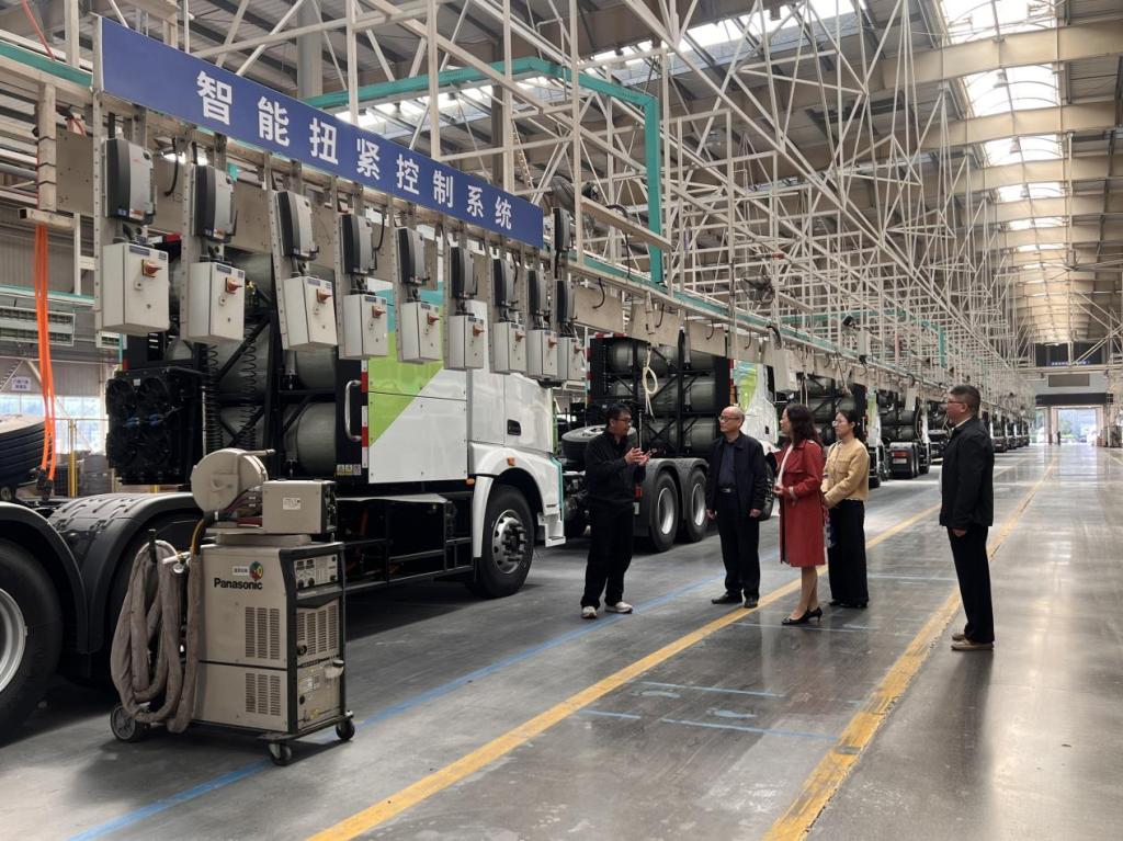 调研中,公司一行深入企业展厅与智能化生产车间,实地观摩氢能重卡总装、调试等核心工艺流程。在总装车间,飞驰科技技术负责人谭少军现场介绍了氢燃料电池系统与底盘的集成装配过程,并介绍,每一台重卡需经过200余项严苛检测才能下线,这对一线技术工人的实操能力提出了极高要求。简经理表示,生产一线的真实场景让我们更直观地认识到产业对人才技能的具体需求,为公司优化实践教学提供了重要参考。