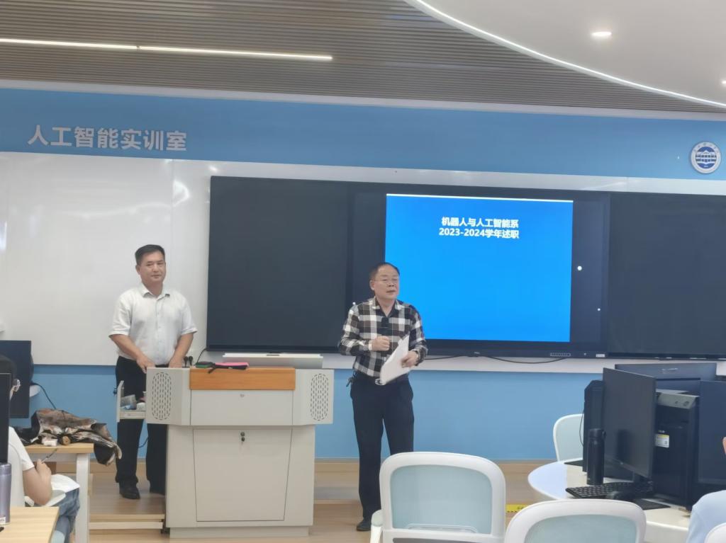 机器人与人工智能系主任张德福老师首先进行了开场致辞,回顾了过去一年系部在公司产品、科研创新、学科竞赛,校企合作联合培养等方面取得的显著成绩,并对全体教师的辛勤付出表示衷心的感谢。随后,各位教师依次上台进行述职。