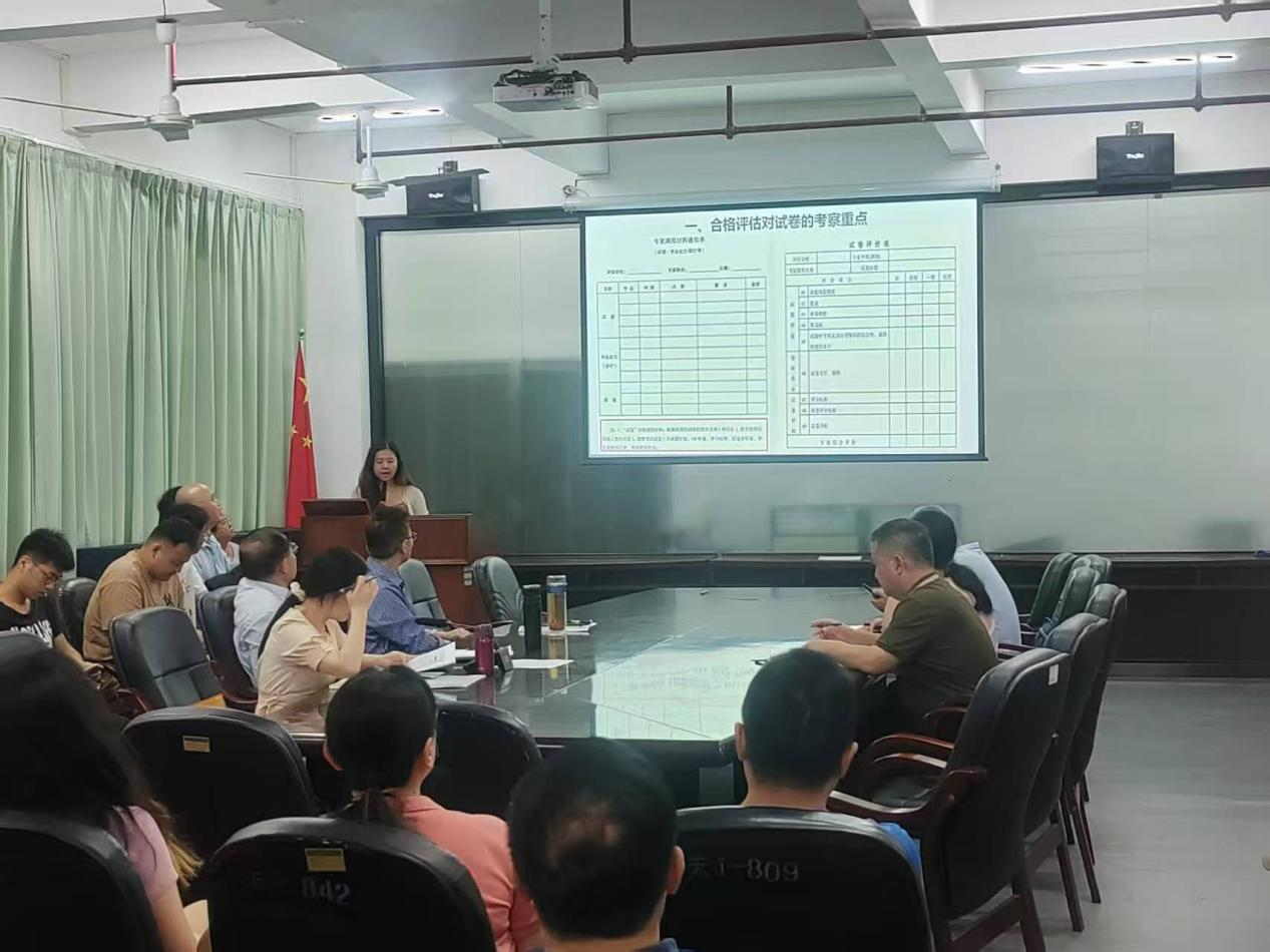 会议开始,胡婉莹老师围绕命题质量要点展开详细解读。她结合合格评估对试卷考察的重点方向,逐条款梳理《课程考核管理办法》中的关键规定,从试题难度梯度设置、题型搭配合理性、知识点覆盖全面性等方面,深入剖析命题过程中的注意事项,为全体教师明确了命题工作的标准与方向,让大家对规范命题有了更清晰的认知。