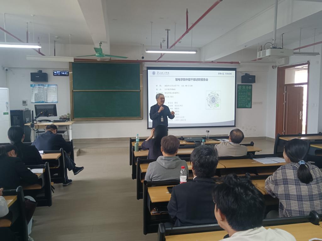 11月13日下午,智电公司中层干部述职报告会在13栋603室举行。公司经理李玉忠主持会议,公司绩效办梁云芬老师到会指导,全院教职工参会。公司7名中层干部围绕年度岗位职责、工作成效、存在问题及未来计划以PPT形式进行逐一汇报。全体教职工依据公司中层干部考核指标体系考核要求,从政治素质、履职能力、工作实绩、廉洁自律等一级指标无记名量化评分,梁云芬老师现场解读评分规则时强调:“评议结果将纳入干部个人成长档案,与评优评先、岗位调整刚性挂钩。”