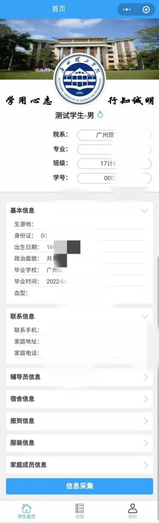 登录成功后,点击底部的“员工首页”菜单,可查看考生个人信息。确认无误后,下滑到页面底部,点击“信息采集”,按照系统提示补全个人信息。(系统会自动更新辅导员、宿舍等信息内容。)