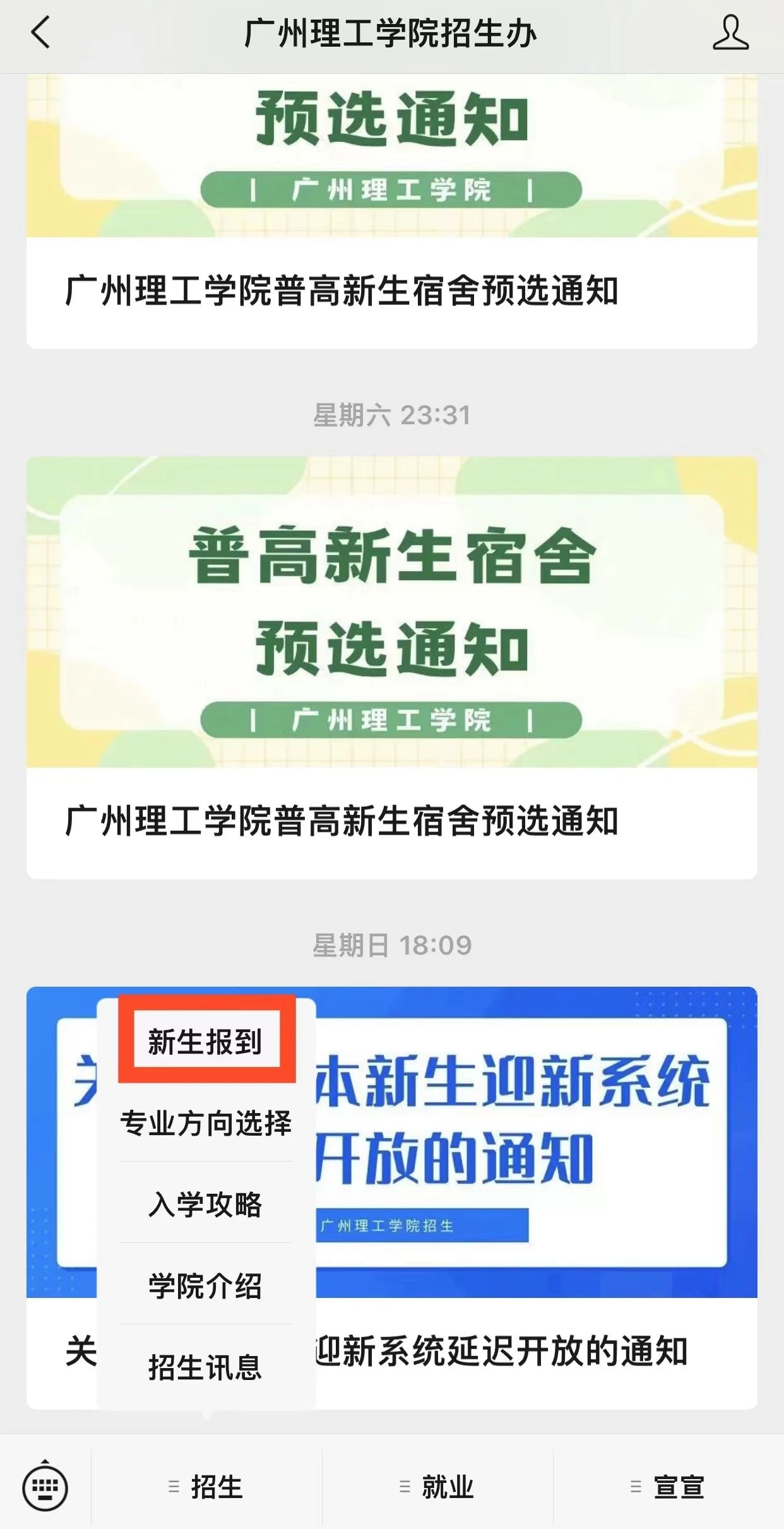 方式二:在微信中搜索并关注:“太阳成tyc7111cc招生办”公众号。进入公众号,在底部菜单中找到“新生报到”菜单项,点击可跳转迎新系统小程序。