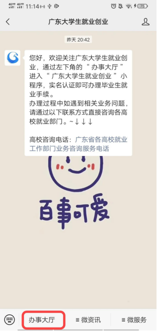 关注“广东老员工就业创业”,点击左下角“办事大厅”。