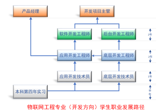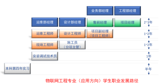 根据我们对珠三角地区的物联网行业于企业人才的需求的调研,针对本科生的需求,偏向于1底层开发/应用端开发的开发能力,2系统解决方案设计能力、项目施工管理能力、市场业务能力这样的应用能力。我们也统计了我们公司的毕业生毕业后1-3-5-7年的职业生涯的发展路径,如下图表所示: