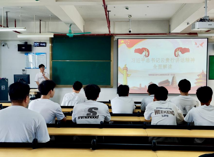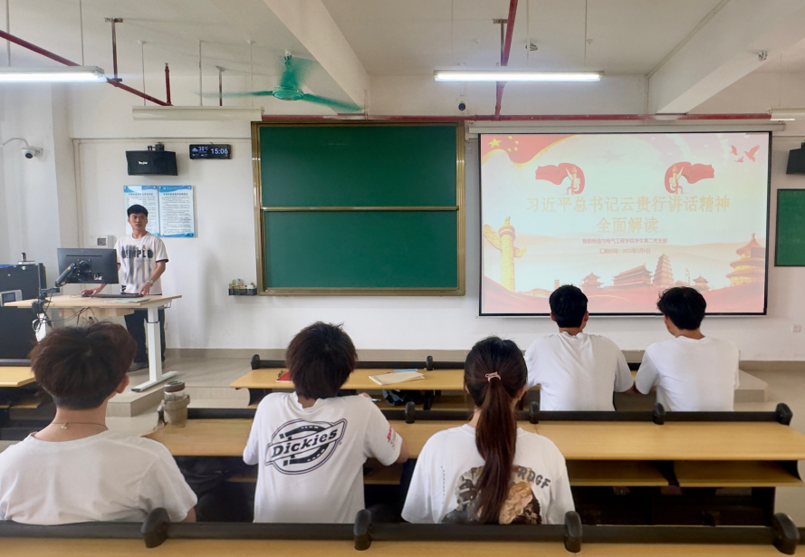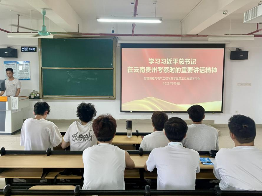 5月8日下午,智电公司三个员工党支部于 13 栋教学楼 405、406、407 教室召开专题学习会,学习贯彻落实习近平总书记在贵州、云南考察时的重要讲话精神。此次学习会由第一党支部副书记何肇哲、第二党支部副书记杨智皓、第三党支部副书记刘梓涵领学,全体员工党员参会。
