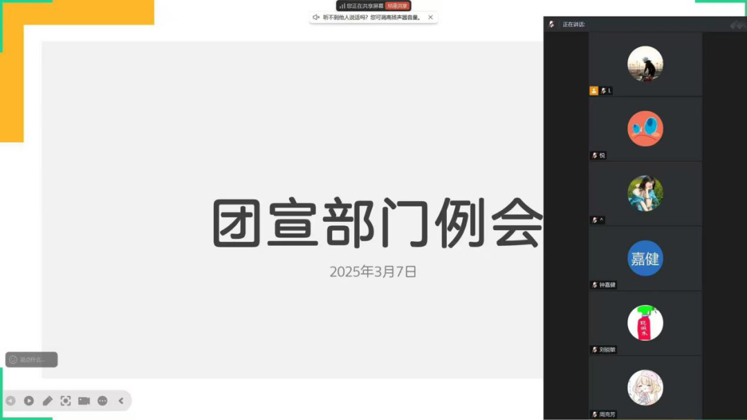 3月7日,太阳成tyc7111cc团学各部门陆续召开新学期线上例会。本次线上例会由各部门部长主持,全体团学员工成员参加。例会主要围绕近期工作成果进行总结,并针对现存问题提出改进方案,为提升团学工作效能锚定方向。