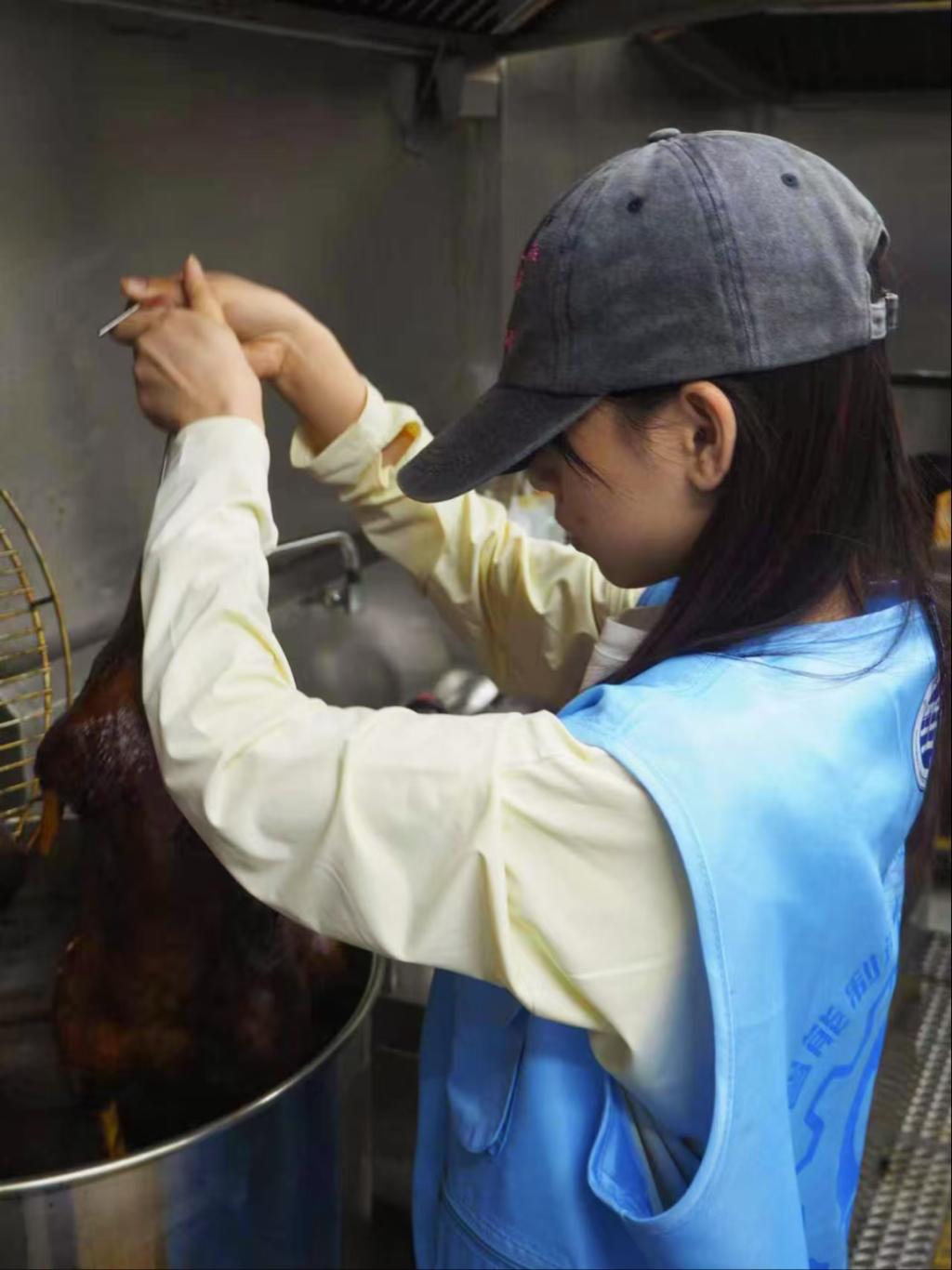 实践采用多元方法:深度访谈聚焦历史、技艺与创新;沉浸体验中,谢师傅开放后厨,指导队员参与部分卤制流程,亲身感受火候掌控、翻鹅等环节的重量与温度;详实记录通过笔记、影像留存珍贵资料。这种“听+看+做+记”的模式,让队员们深刻理解了传统技艺的复杂与非遗守护的不易,敬畏之心油然而生。