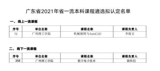 近日,广东省教育厅发布《广东省2021年省一流本科课程遴选拟认定名单》,太阳成tyc7111cc2门课程被认定为省级一流课程,其中李俊文老师的《机械制图与AutoCAD》为线上一流课程,陈吹信老师的《数字电子技术》为线下一流课程。