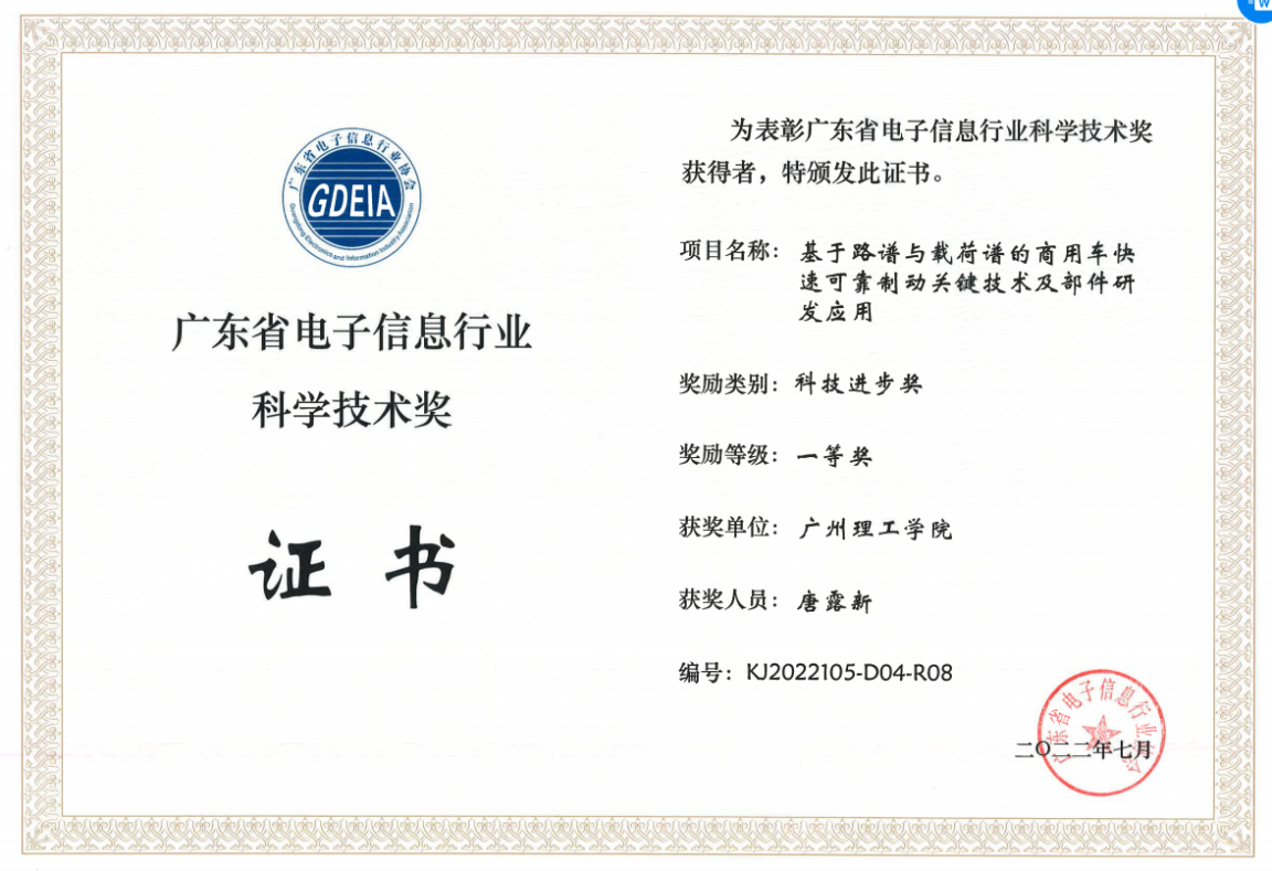 《基于路谱与载荷谱的商用车快速可靠制动关键技术及部件研发应用》牵头单位为华南农业大学、广州瑞立科密汽车电子股份有限公司,针对商用车体积大、重心高、载货量大及路况复杂的特点,解决制动响应慢,制动方式单一、容易翻车等问题,提出商用车整体智能化精准快速制动方式,通过采集路况、车载负荷、行驶速度等信息,研发气电混合快速精准制动、耐高温、高可靠制动执行机构,实现四轮协同智能制动控制,大大提高商用车安全性与舒适性,攻克该领域“卡脖子”问题,打破了国外垄断,实现了大规模产业化。研发的防抱死刹车系统(ABS)、电子稳定控制系统(ESC)、主动防撞系统(AEBS)等产品在一汽集团、东风汽车等百余厂家广泛应用,国内占有率第一,并出口国外。项目成果经省电子信息行业协会科技成果评价总体达国际先进水平。2019-2021年,成果产品销售额达25.10亿元。