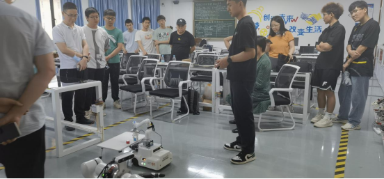 在此次交流中,该公司向我们介绍了一系列史河产品以及其产品特点,如MR系列产品、移动抓取机器人、爬壁打磨开发平台,同时也向我们进行了桌面级移动抓取教学机器人的移动抓取功能演示,随后讲述了相关核心技术及技术成果。