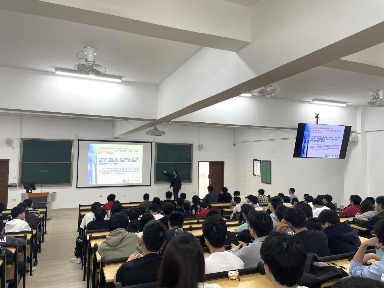 朱长青教授重点向同学们介绍了无接触电能传输的基本方式以及当前需解决的关键问题,在现场还与同学们互动讨论了CPT技术的应用与发展趋势。在场同学认真听讲,在了解了CPT技术在便携类设备、生物医学工程领域、能源交通方面、移动机器人、空间太阳能电站(SPS)的应用价值后表现出赞叹,纷纷表示以后会认真学习,打好基础,争取涉足无接触传能技术的研究。