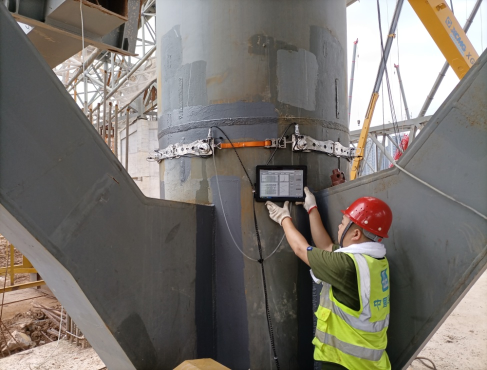 公司声学检测研究所为解决超长、超高和超大的滑道八组钢管混凝土桁式混合巨柱内部混凝土密实度检测与质量评价难题,在前期研究基础上,进行了一系列专项研究试验,开发出新型专用钢管混凝土浇筑质量超声检测系统,本系统在以下方面形成突破:(1)曲面结构非传统对象超声良好耦合;(2)非均质大尺寸结构所需发射大功率超声波激发器;(3)高大构件测点高效定位与换位精准测量;(4)现场复杂环境超声数据高速采集与传输;(5)采用现有规范中的评价技术指标,集成当前国内外新技术指标及人工智能算法。该技术目前已经用于深圳前海冰雪世界项目钢管混凝土巨柱,并持续检测到今年底混凝土浇筑结束。