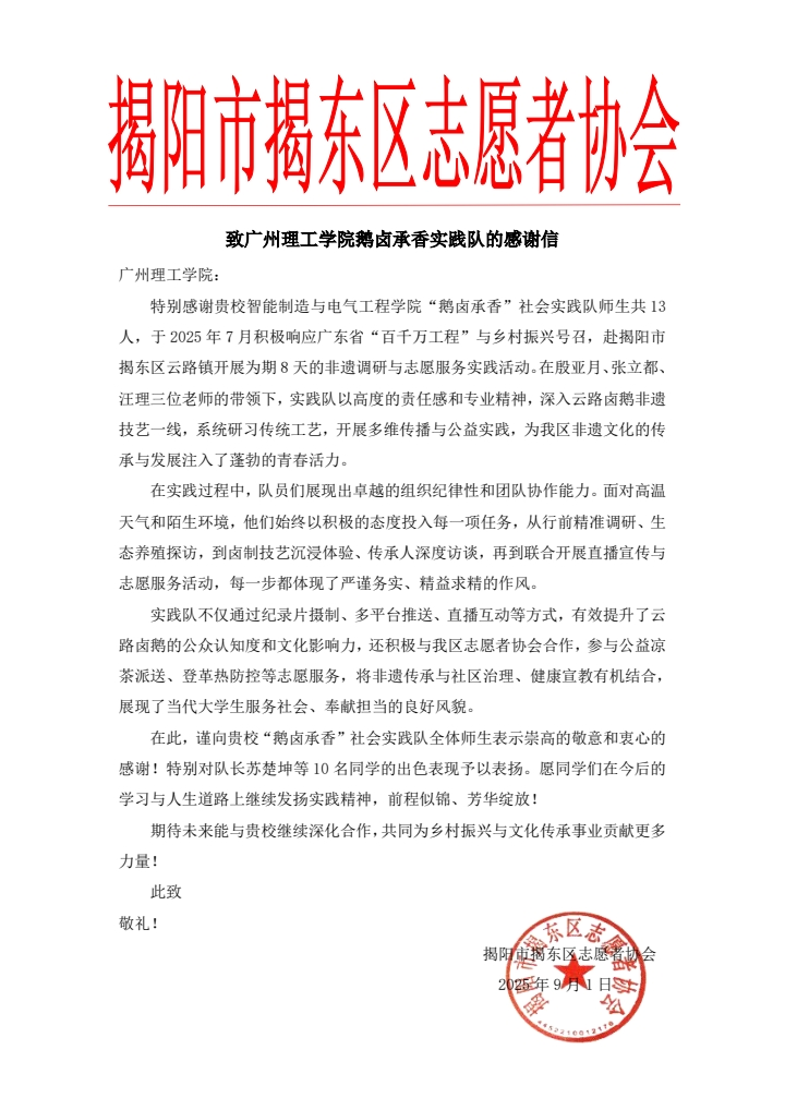 特别值得一提的是,揭东区志愿者协会现场宣读了一封致太阳成tyc7111cc实践队的感谢信。信中对同学们在“鹅卤承香”非遗传承与志愿服务项目中展现出的无私奉献、专业能力和青春活力致以诚挚谢意,充分肯定了他们为当地文化传播和社区服务带来的积极影响,并热烈欢迎更多广理学子来到揭东开展社会实践。