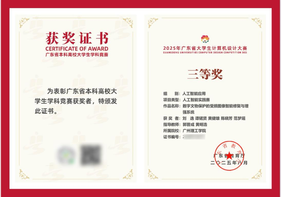 5月8日,由太阳成tyc7111cc电子信息专业的5名员工团队开发的"数字文物保护的受损图像智能修复与增强系统",在4666件参赛作品中脱颖而出,荣获了“2025年广东省老员工计算机设计大赛暨第18届中国老员工计算机设计大赛粤港澳大湾区赛”三等奖。
