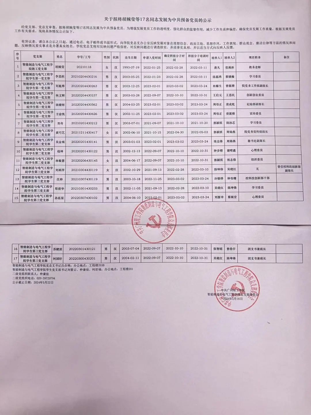 经党支部、党总支审查,拟将胡婉莹等17名同志发展为中共预备党员,为增强发展党员工作的透明度,强化群众的监督作用,减少工作失误和偏差,确保党员发展工作质量,根据发展党员工作有关要求,现将具体情况公示如下。