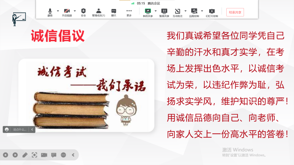 12月18日晚,为进一步加强学风建设,严肃考风考纪,智电公司在线上召开诚信考试教育主题班会,班会由各班辅导员老师主持,全体员工参会。