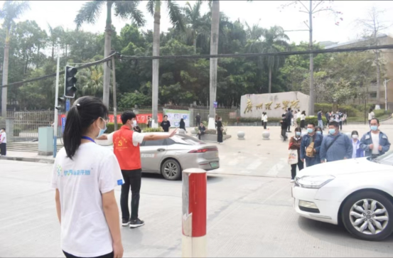 志愿者们身穿红马甲,手持文明交通宣传旗,为即将赴考的考生指引道路,确保考生顺利通行,平安到达考场。同时,倡导考场附近的商户和过往的车辆及行人在考试期间采取“静音模式”,助力考生顺利完成全国英语等级考试。
