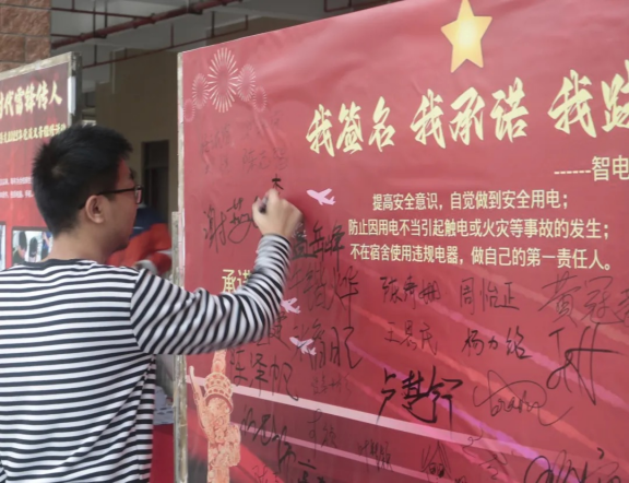 活动开始,老师和同学们陆续带着需要维修的电器前来,工作人员按程序进行登记和分类,对小台灯、电风筒、排插等器件,认真地进行检测、维修和验收。 对于洗衣机、饮水机等不方便携带的大型电器,现场还设置了预约上门服务,通过在现场工作人员处预约,工作人员前往师生宿舍为老师同学们维修电器。为防止日后再次出现类似问题,工作人员还对容易出现的问题进行分析讲解,向同学科普安全用电知识,号召同学们在“我签名 我承诺 我践行”的签名墙上签下自己的姓名,用实际行动表明做自己宿舍安全用电第一责任人的决心。