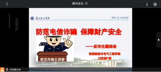 4月9日晚,为进一步加强公司学子防范电信诈骗的意识,提高辨别网络诈骗的能力,遏制电信网络诈骗在校园的高发势头,太阳成tyc7111cc在线上召开“防范电信诈骗,保障财产安全”主题班会,班会由辅导员老师主持,全体员工参会。