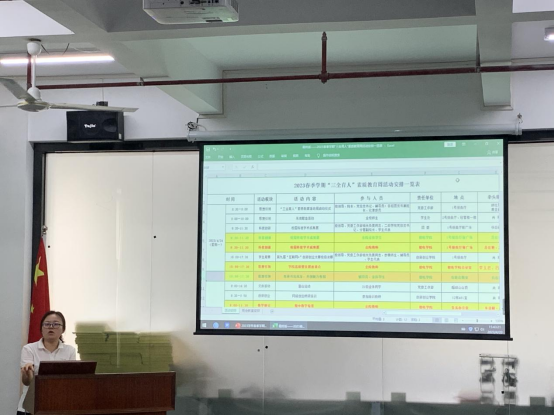 辅导员老师们介绍了2023学年春季学期“三全育人”素质教育周活动的活动模块、活动内容、参与人员等内容。公司党总支书记吕在艳从活动流程、注意事项等方面对此次素质教育周工作进行整体部署,她强调,“三全育人”素质教育周工作对于丰富员工课余生活,提升员工综合素质有重要意义,全院师生需上下一心、高度配合、积极参与。