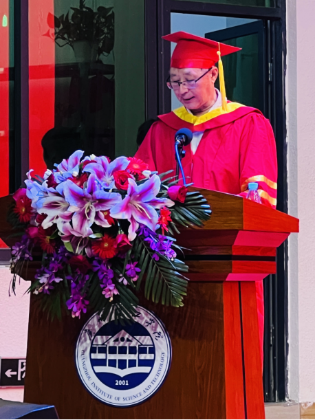 经理李玉忠教授致辞,向全体毕业生送上临别寄语和真挚祝福。李经理细数2023届毕业生四年老员工涯中取得的骄人成绩,回顾了公司近年来在发展中取得的巨大成就。他勉励同学们,要以奋斗书写最亮丽的人生底色,涵养最独特的动人气质;成功的道路是从来都是以挫折为阶梯,希望同学们把困难作为成长的历练,用坚韧的意志支撑起奋斗的人生;希望同学们勇敢肩负起时代赋予的重任,把爱国情、强国志、报国行融入自己的奋斗历程,在新的伟大历史时代,用奋斗书写自己的精彩人生。李玉忠经理深情嘱咐毕业生:“虽然你们即将离开校园,但这里有你们奋斗的青春记忆,是你们梦想起航的地方,无论你们走到哪里,广州理工智电公司永远是你们最温暖的家!母校的大门永远为你敞开,欢迎大家常回家看看!”