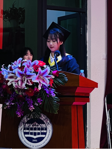 19中兴通信2班曾静丹同学作为毕业生代表讲话。她代表全体毕业生向辛勤培育员工的各位老师,表示最崇高的敬意;向这么多年来辛勤操劳的父母,表达最衷心的感谢;向四年来一起朝夕相处同学们,表达最真诚的祝福,在即将开始新的征程之际,已经做好了准备,会转变角色,全力投入新的征程中,在不断提升中闪耀自身的价值。