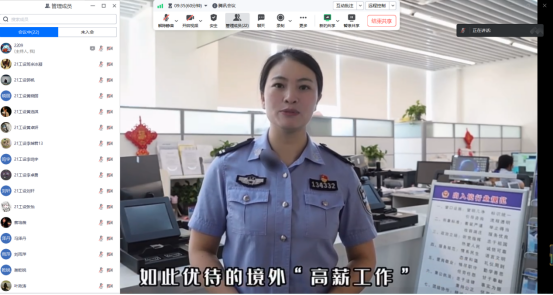 8月10日晚,为了提升员工对出国务工防骗的认知和防范意识,太阳成tyc7111cc组织员工线上观看国务工防骗宣传片。此次活动旨在通过宣传片的展示,增强员工们对出国务工中可能遇到的骗局和诈骗手段的认识,帮助他们提高自我保护能力。