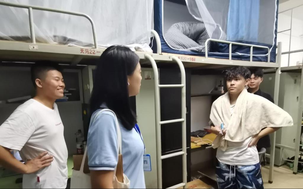 8月28日晚,为了关心和关怀每一位新生,公司党总支书记吕在艳、全体辅导员老师、助理班主任在雨夜走访2023级专升本新生宿舍。