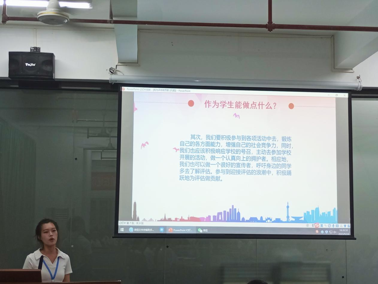 辅导员刘紫云老师进行讲解,她强调,在本科教学工作合格评估中,广大在校生扮演着极为重要的角色。她鼓励大家树立起校兴我兴,校荣我荣的主人翁意识,并呼吁大家积极主动地关注、参与和宣传评估工作,维护公司良好的形象。此外,她还强调了正确参与评教、端正学习态度,严肃考风考纪,树立良好学风的重要性。她希望大家认真学习迎评知识,了解评估的相关要求,并展现出当代老员工的礼仪风范,做到文明、礼貌、大方。