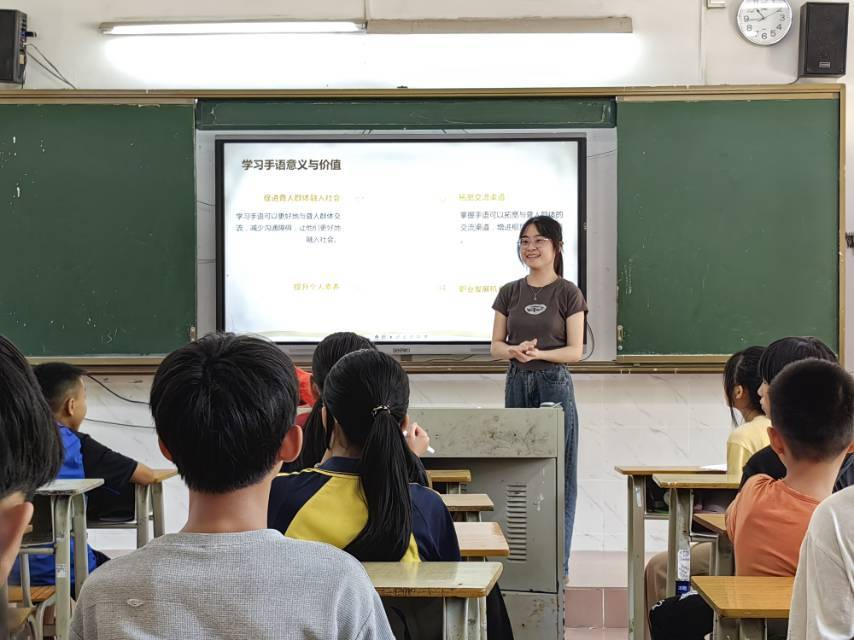 在手语课上,通过猜手语小游戏的导入来调动小朋友们的兴趣,使课堂的氛围活跃起来。在对手语进行简单介绍后,张钰翎同学开始教授基础手语词汇。为了确保每位小朋友都能准确理解,张同学的每一个手势都做得标准而有力,每一句话话语都表达得清晰明朗,小朋友们则全神贯注地盯着张同学的双手,生怕错过任何一个细节。