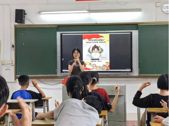 在最后一堂手语课上,张钰翎同学通过“手语记忆猜猜猜”的课前活动引起小朋友们的兴趣。她简单介绍了一些常见称谓和季节的手语动作,然后让小朋友们猜测。张同学还为小朋友们普及了包括问候、礼貌用语等基础手语知识,并满怀热情地教授手语操《我和我的祖国》。