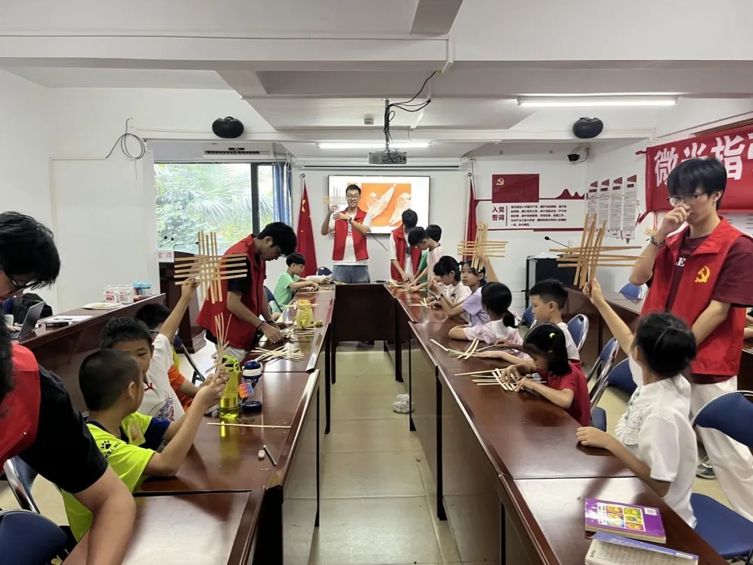在日常的课业辅导环节,实践团成员们耐心地为员工们解答学习中遇到的难题,帮助他们巩固知识、查漏补缺,让每个孩子都能得到充分的关注和指导,有效提高了学习效率。而在下午举办的创意手工非遗竹编课程上,孩子们与实践团成员都兴趣满满。主讲人22电信1班谭诺贤与实践团成员们手把手地传授竹编技艺,让青少年们亲身感受到了传统文化的魅力。一根根竹子在孩子们的手中变成了精美的竹编小船,他们在创作中收获了乐趣和成就感。
