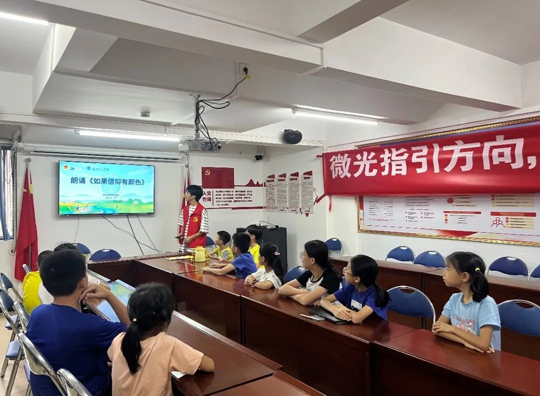 随后,22机器人1班吕立濠带领孩子们与实践团成员共同朗诵了《如果信仰有颜色》。诗歌的语言激励着每一个孩子心中的信仰之光,温暖而坚定地照亮他们的前行之路。朗诵声中,孩子们仿佛看见了未来的自己,在科技的世界里自由翱翔。伴随着优美的诗句,活动在充满希望与感动的氛围中圆满结束。孩子们的脸上洋溢着笑容,眼中闪烁着对未来的无限憧憬。