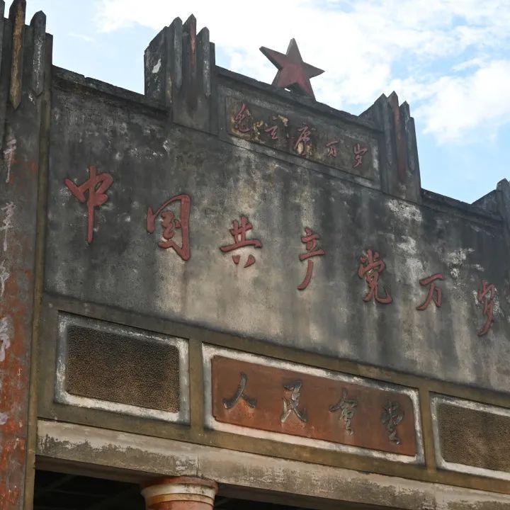 创想突击队在梅蓄新村委员温崇金和留畲村委员的带领下,来到了隐藏在五华县龙村镇的一座承载着深厚历史记忆与红色印记的建筑——留畲村人民会堂。这座会堂不仅是近现代重要史迹及代表性建筑之一,更是留畲村村民心中不可替代的精神家园。踏入留畲村,沿着古朴的青石板路缓缓前行,不久便能见到这座焕然一新的会堂。经过精心修缮,会堂大门上方的那颗大红五星在墙顶上熠熠生辉,苍劲有力的大字与长满青苔的墙体相映成趣,仿佛诉说着往昔的辉煌与沧桑。
