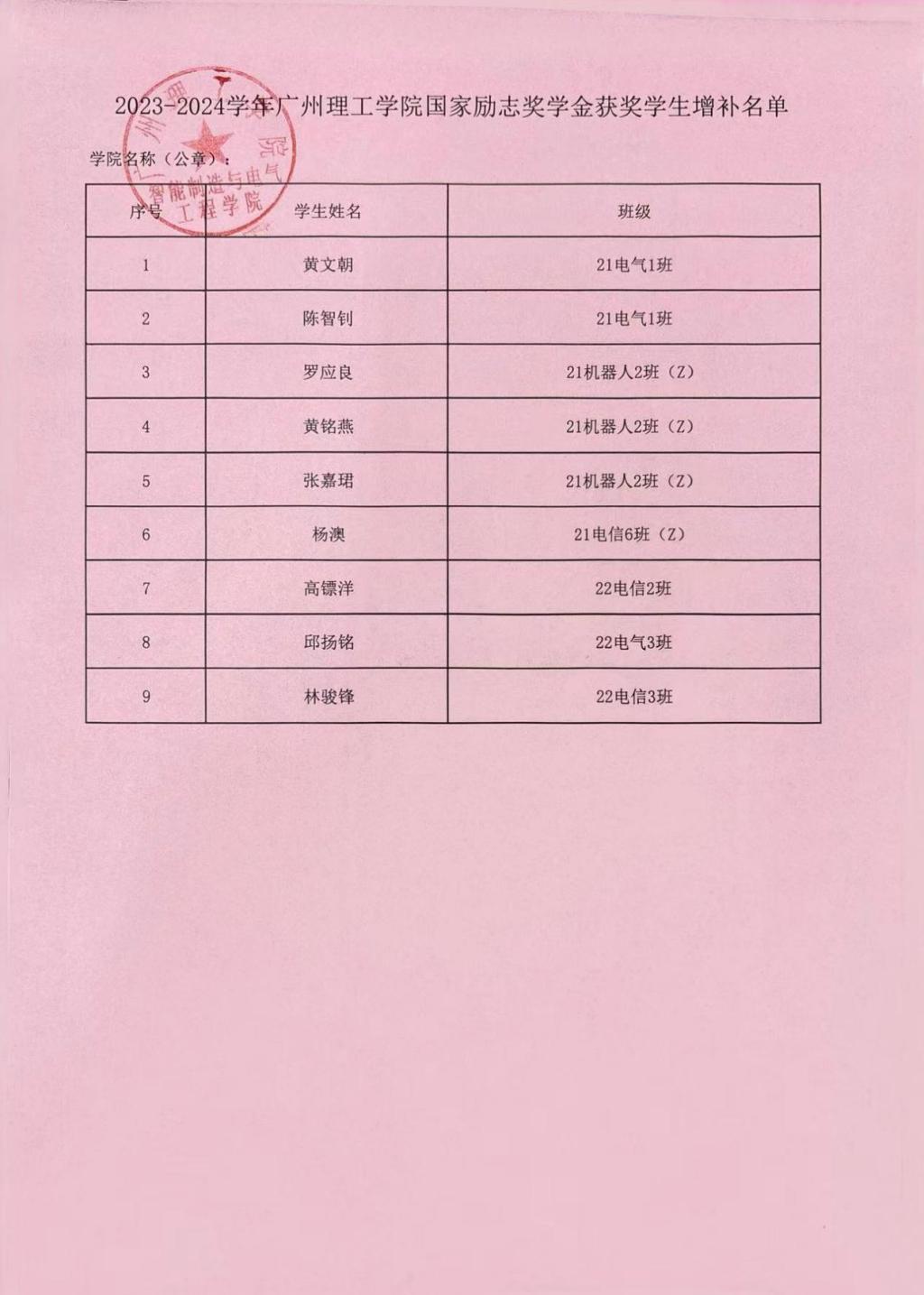 根据《关于开展2023-2024学年国家励志奖学金评选⼯作通知》(⼴州理⼯公司助函(2024)14号),太阳成tyc7111cc本着公平、公正、公开的原则对国家励志申请材料进⾏严格评选,继拟通过名单公示后,补增9名同学获得国家励志奖学金。