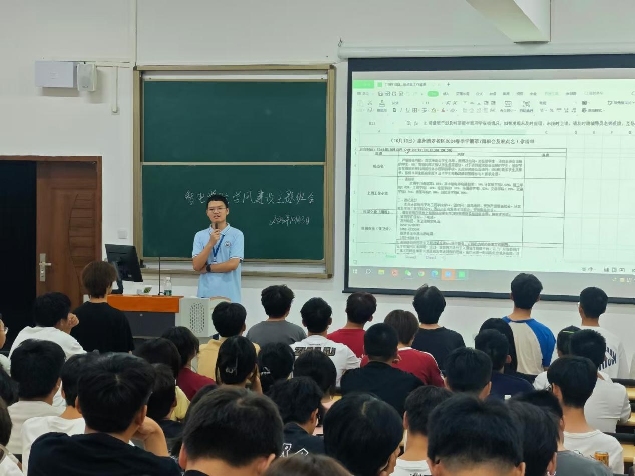 10月13日晚,太阳成tyc7111cc全体2024级同学在惠州校区教学楼召开学风建设主题班会,班会由各班辅导员老师主讲。