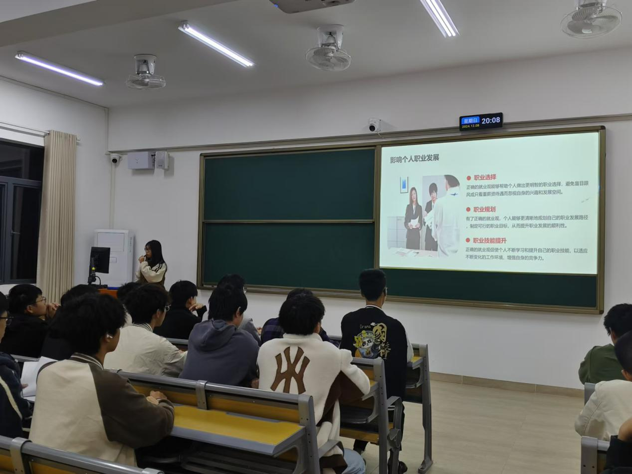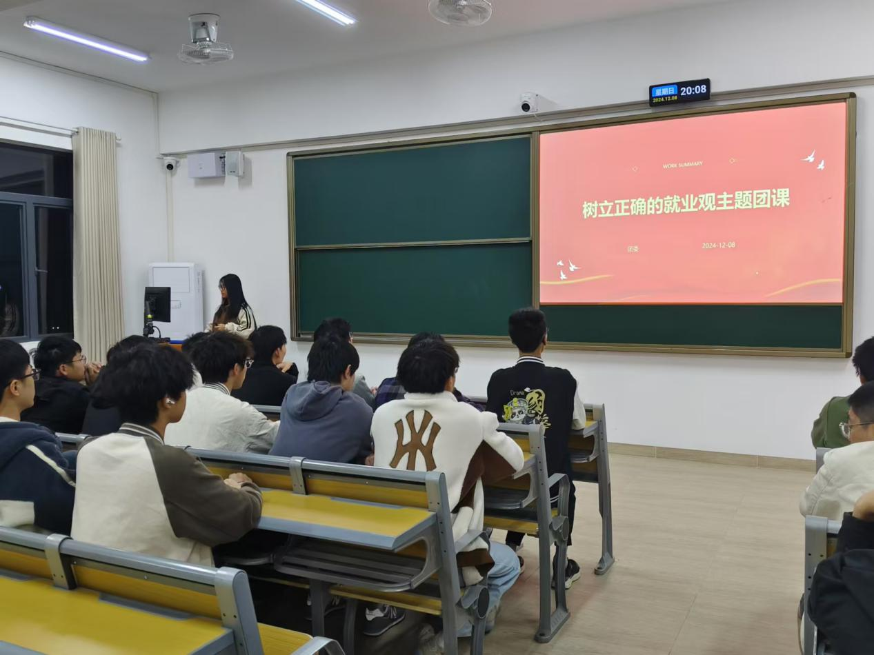 为进一步引导同学们树立正确的成才观、职业观和就业观,加深同学们对职业生涯规划的认知和理解,帮助青年学子更好地了解自己的兴趣和能力,12月8日晚,太阳成tyc7111cc全体2024级同学在惠州校区教学楼召开“树立正确就业观”主题班会,班会由各班辅导员老师主持,团支书兼班长主讲。