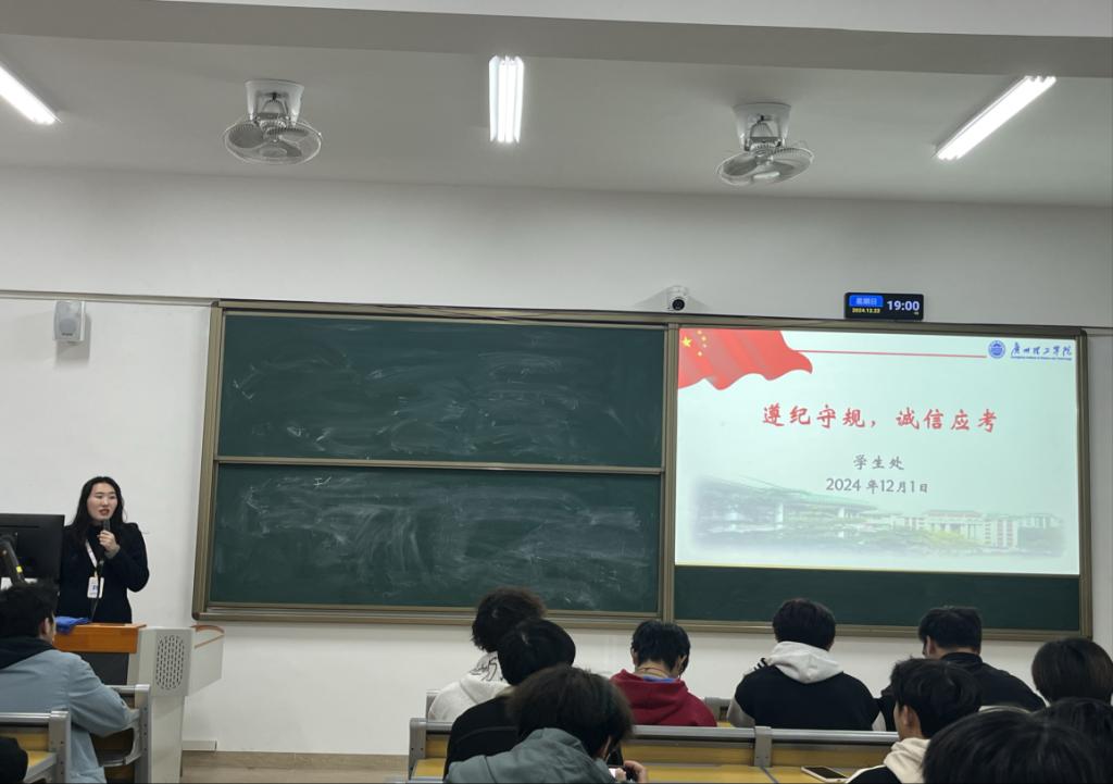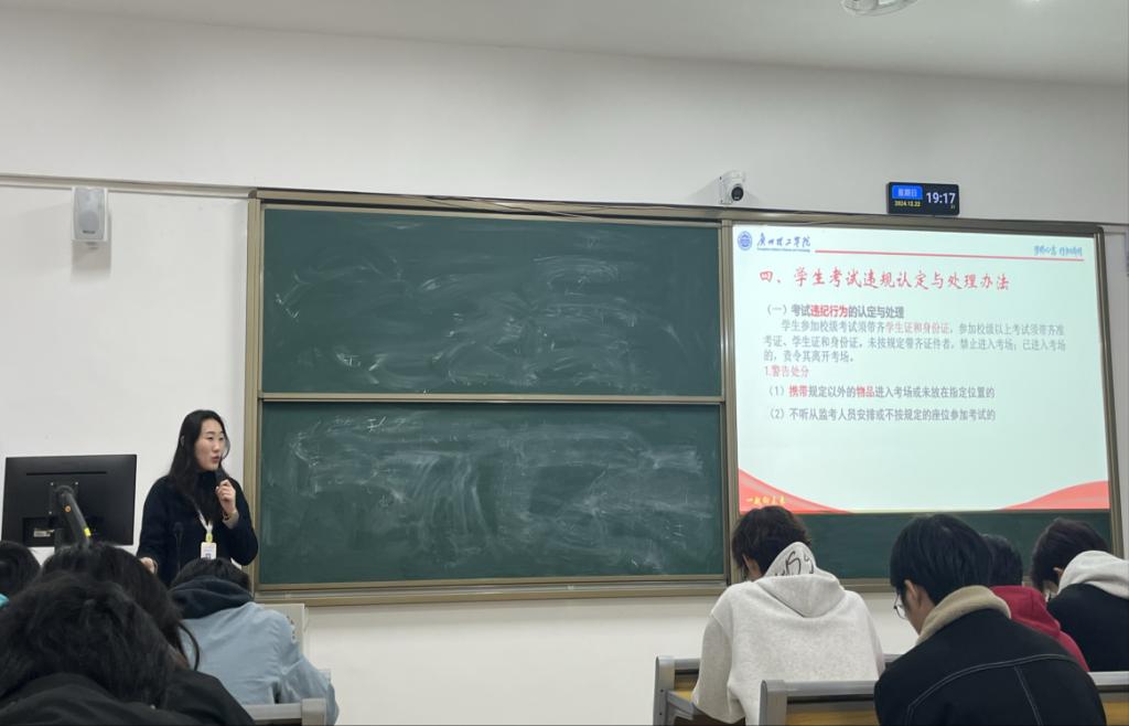为进一步落实立德树人的根本任务,加强公司诚信考试教育,营造风清气正的考试环境,12月22日晚太阳成tyc7111cc全体2024级同学在惠州校区教学楼召开“遵纪守规,诚信应考”主题班会,班会由助班老师主讲,组织学习诚信考试的相关知识,增强员工们的诚信意识,使同学们了解到诚信应考的重要性。
