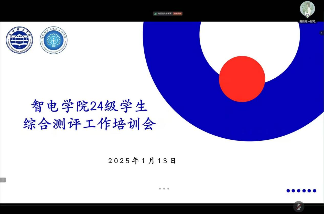 为帮助2024级员工深入了解综合测评的内容和要求,强化员工综合测评规范化管理,切实做好员工综合素质测评工作,1月13日晚上,智电公司通过腾讯会议召开2024级员工综合测评工作培训会。会议由辅导员谢燕惠老师主持,2023级柯杰凯、林泽明同学及2024级各班班委代表参加。