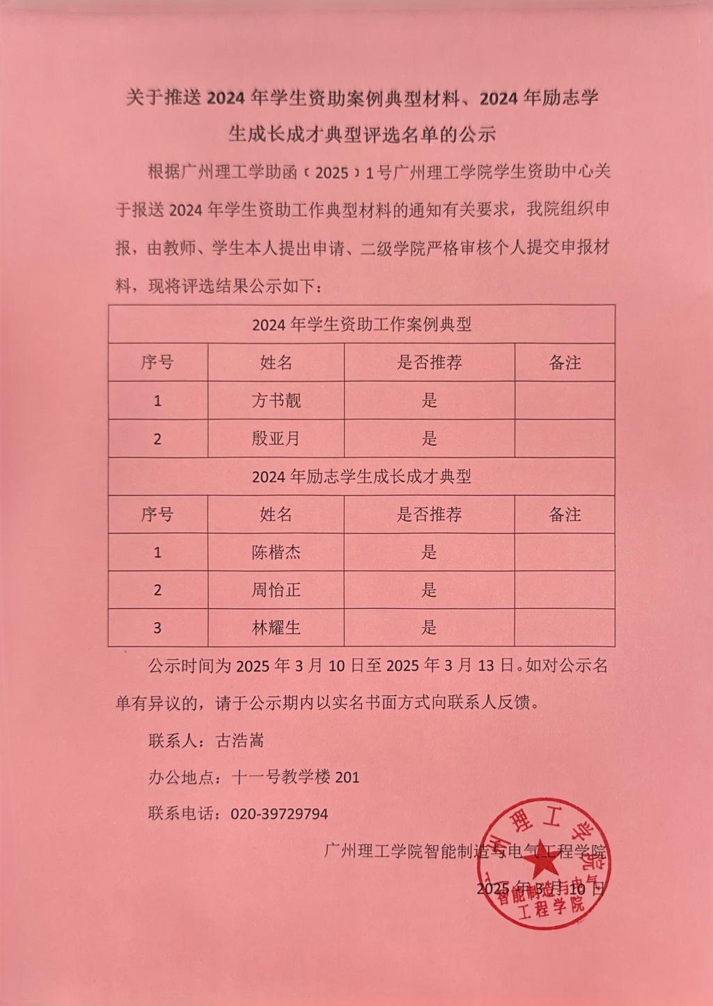 根据广州理工学助函﹝2025﹞1号太阳成tyc7111cc员工资助中心关于报送2024年员工资助工作典型材料的通知有关要求,公司组织申报,由教师、员工本人提出申请、二级公司严格审核个人提交申报材料,现将评选结果公示如下: