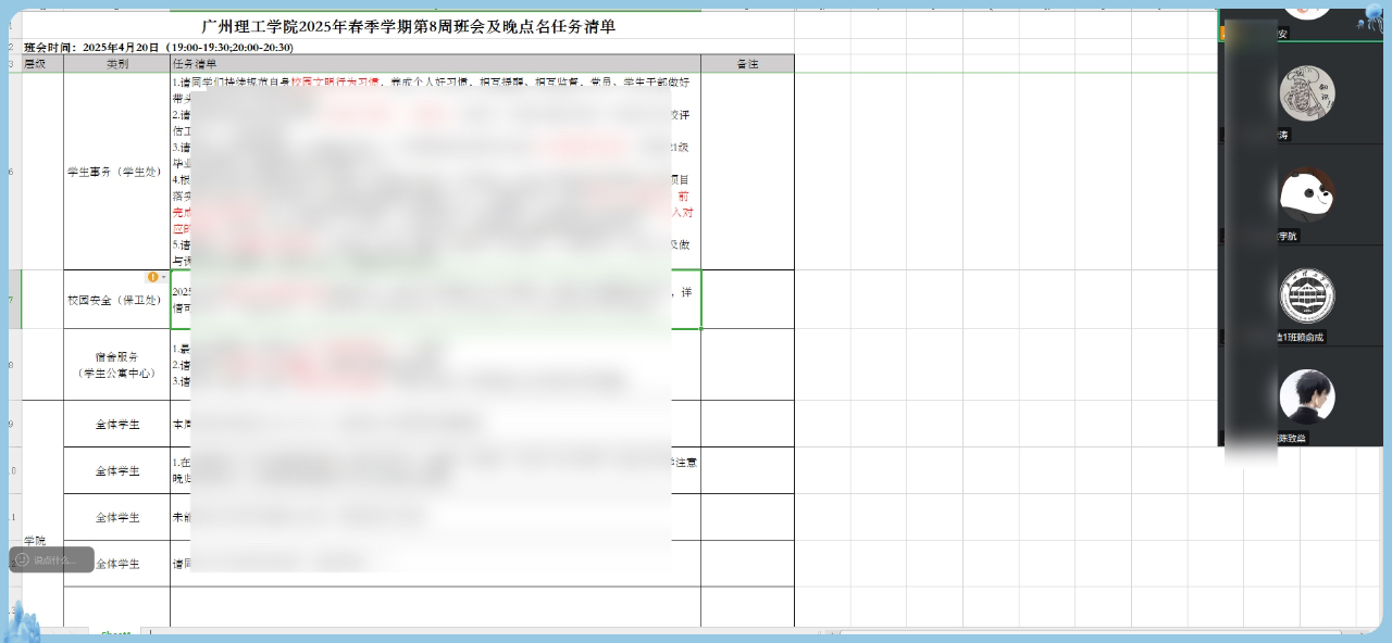 4月20日晚,智电公司通过线上会议形式召开了2025年春季学期第八周班会,辅导员与班长主讲,全体同学参与。