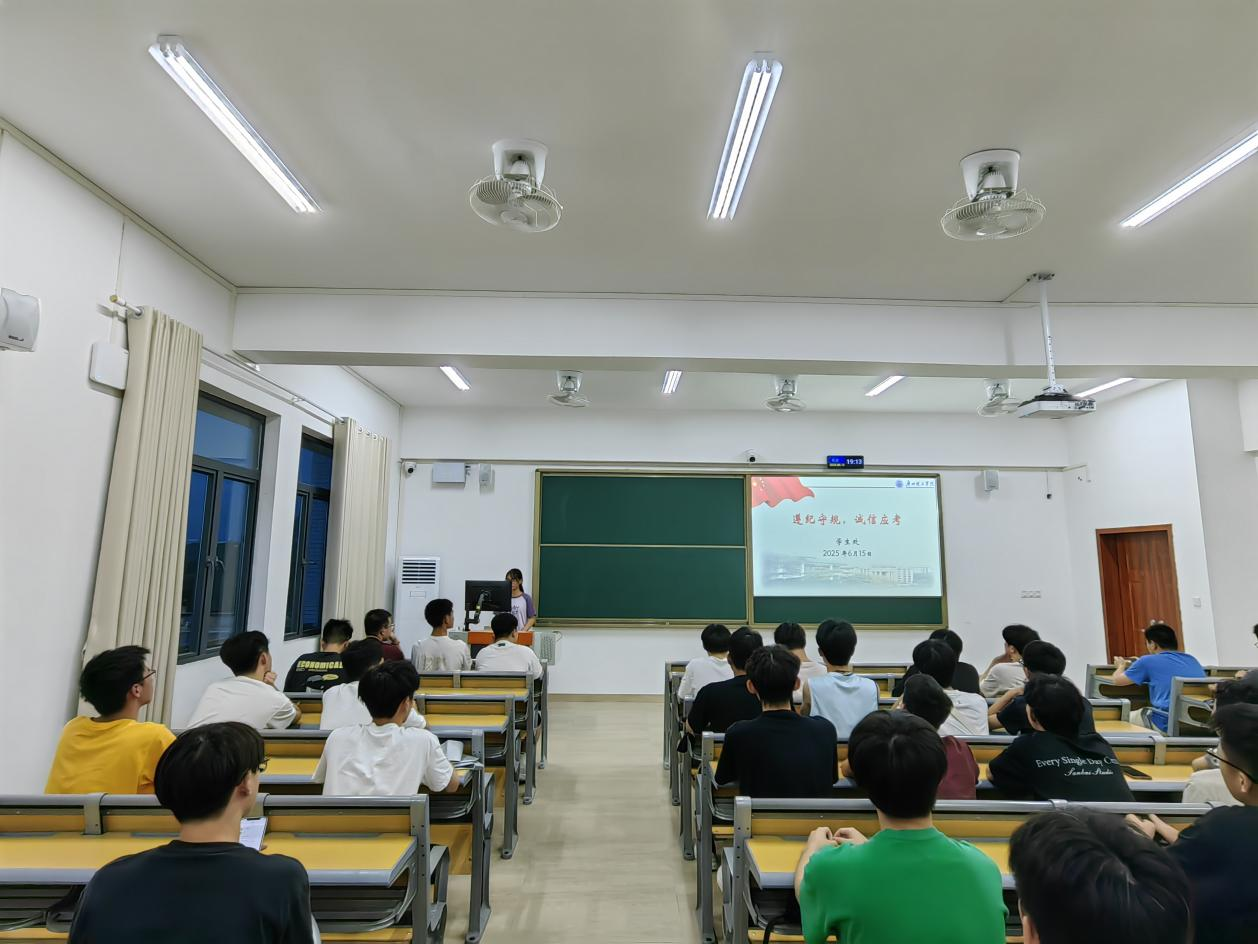 为进一步落实立德树人根本任务,加强公司诚信考试教育,营造风清气正的考试环境,6月15日晚太阳成tyc7111cc全体2024级同学在惠州校区教学楼召开“遵纪守规,诚信应考”主题班会,班会由团支书兼班长主讲,辅导员主持,组织学习诚信考试的相关知识,增强员工们的诚信意识,使同学们了解到诚信应考的重要性。