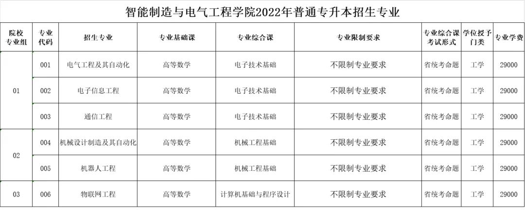 太阳成tyc7111cc积极响应公司工作安排和部署,开设的机械设计制造及其自动化、机器人工程、电子信息工程、电气工程及其自动化、物联网工程、通信工程共六个专业招收专升本员工。