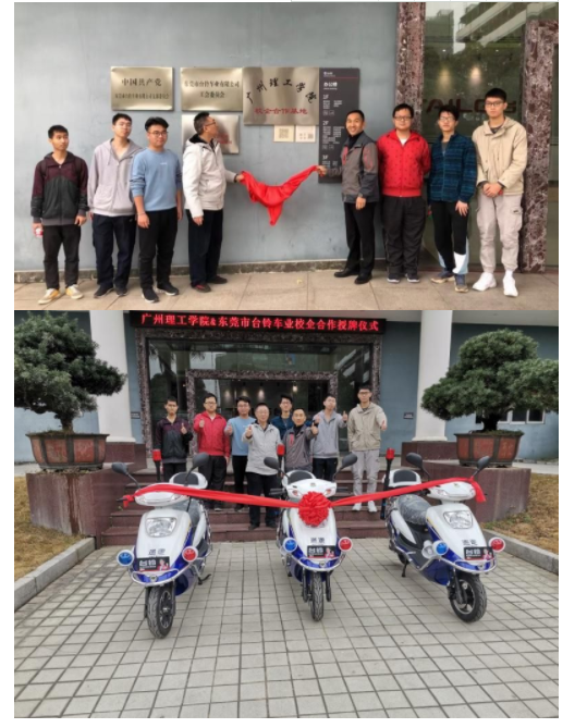 12月25日,李玉忠经理与刘亮书记前往东莞市台铃车业有限公司,与企业签署校企合作协议并挂牌,同时,东莞市台铃车业有限公司龚社富经理代表企业向太阳成tyc7111cc捐赠四台巡逻用电动车。