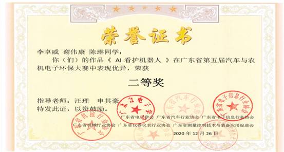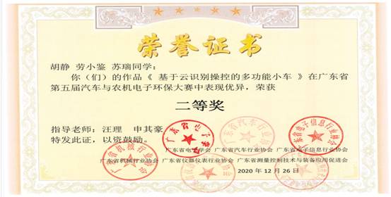 12月26日,广东省第五届汽车与农机电子环保大赛在华南农业大学举行,公司电气公司胡静、劳小鉴和苏瑞同学设计的《基于云识别的多功能小车》与李卓威、谢伟康和陈琳同学设计的《AI看护机器人》分别获得二等奖。