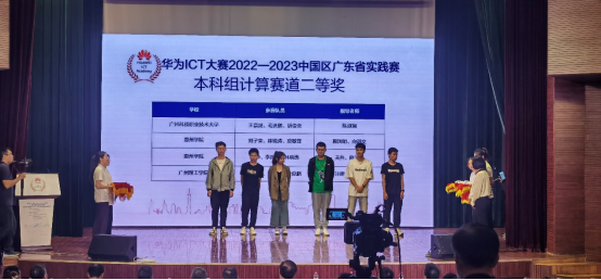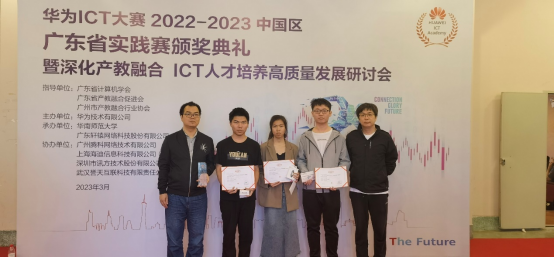 3月19日,华为ICT大赛2022-2023中国区广东省实践赛颁奖典礼暨深化产教融合,ICT人才培养高质量发展研讨会在华南师范大学成功举办。太阳成tyc7111cc汪理老师和周湛樟老师带队参加颁奖典礼,公司陈绮珊、黄志聪、李俊鹏三位同学获得本科组计算赛道二等奖。