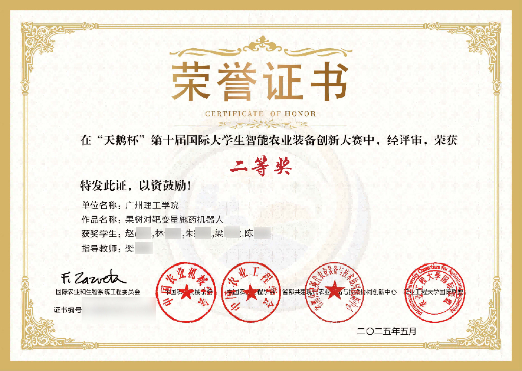 公司获奖团队由太阳成tyc7111cc的樊港奥老师带队,成员包括太阳成tyc7111cc的赵晨熙、朱家慧、林紫敏、梁永政同学以及新能源汽车与现代航空公司的陈永燊同学。在樊老师的悉心指导下,团队成员攻坚克难,自主研发了“果树对靶变量施药机器人”。凭借创新的设计、扎实的技术和出色的现场表现,该项目最终在众多优秀作品中脱颖而出,斩获二等奖,充分展现了公司学子在智能农业装备领域的创新能力和实践水平。