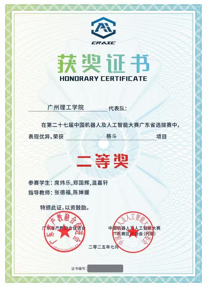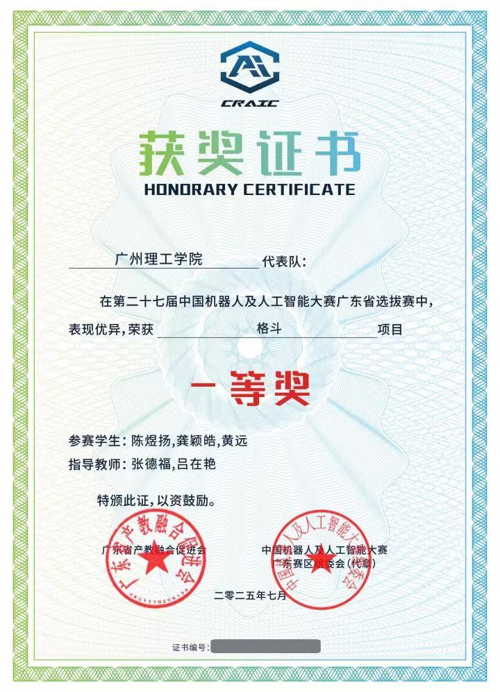 第二十七届中国机器人及人工智能大赛广东省选拔赛成绩揭晓,公司学子表现优异,在格斗赛项目中斩获佳绩。其中,由公司张德福,吕在艳,陈婵媛,李彬老师指导的陈煜杨同学,黄远同学,龚颖皓同学荣获省赛一等奖,席炜乐同学,郑国辉同学,温嘉轩同学荣获省赛二等奖,司马朝安同学,卓泓霖同学,冯志政同学荣获省赛三等奖,展现了公司在人工智能及机器人领域人才培养方面的突出成果。